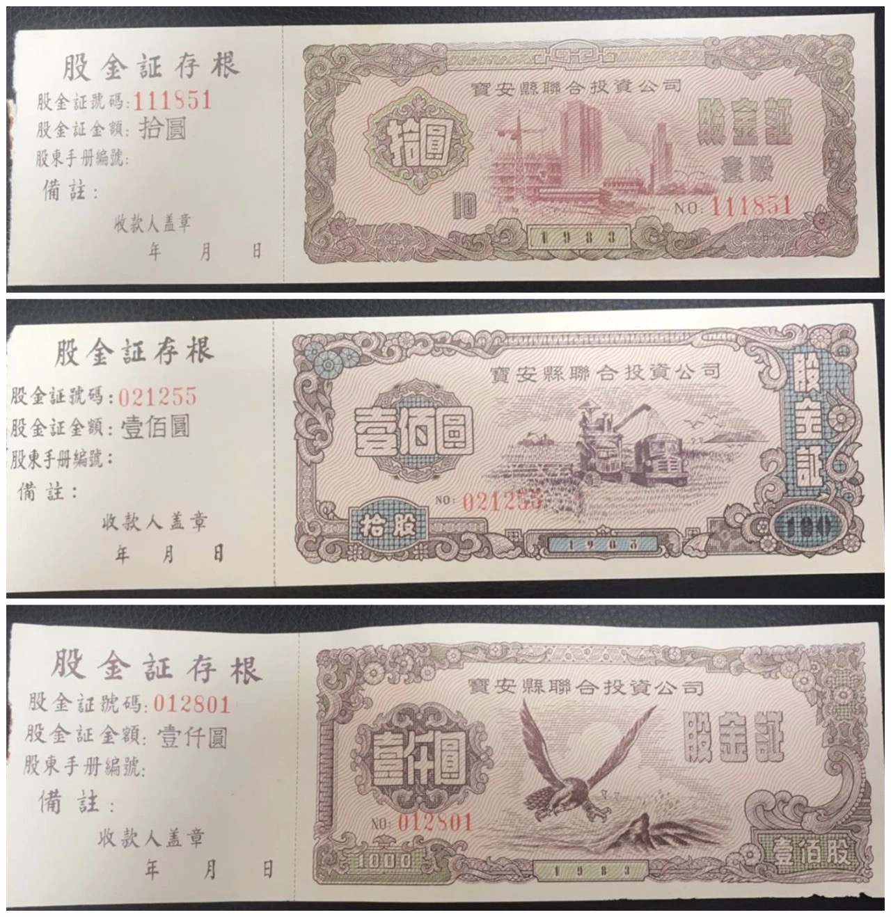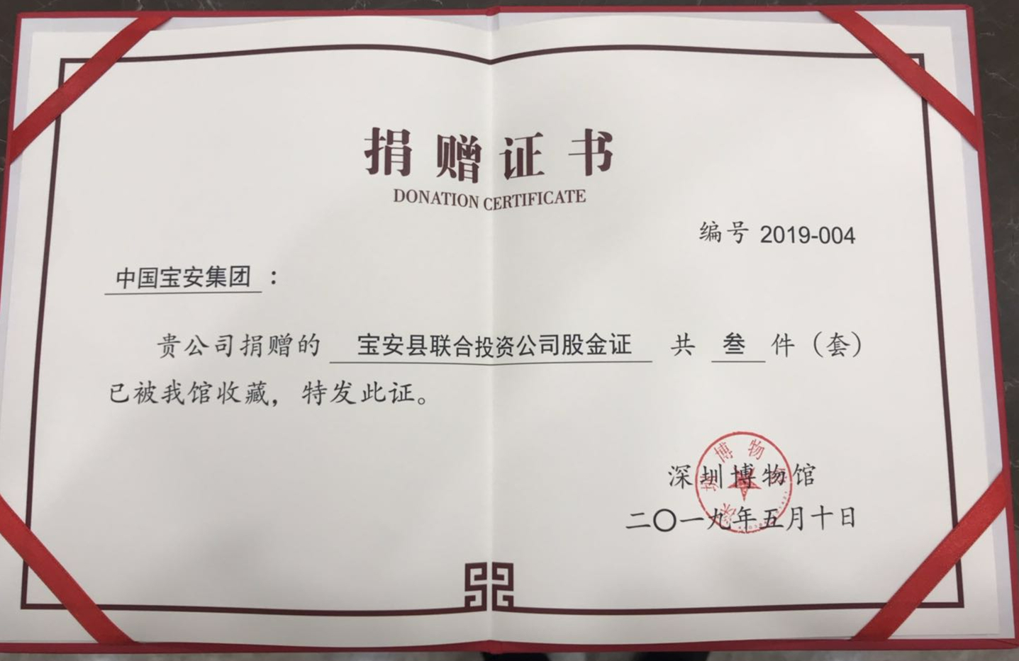 深圳博物館入藏的新中國第一張股票套裝是集團成立之初于1983年發行的股金證,分為1000元、100元和10元三張。捐贈儀式以及座談會近日在深圳博物館舉行,博物館副館長蔡惠堯主持會議并代表博物館正式收藏此套股金證。在座談會上,蔡館長表示,恰值改革開放四十周年時期,由中國寶安集團發行的新中國第一張股票具有重要的歷史意義,通過這套股金證,公眾能再次感受到特區第一批建設者們勇于開拓、勇于創新的奮斗精神。