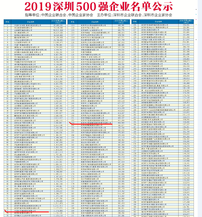 7月30日,《2019深圳500強企業發展報告》正式公布,“2019深圳500強企業”名單按照營業收入排序,集團名列第77位,集團所屬企業貝特瑞排在第153位。