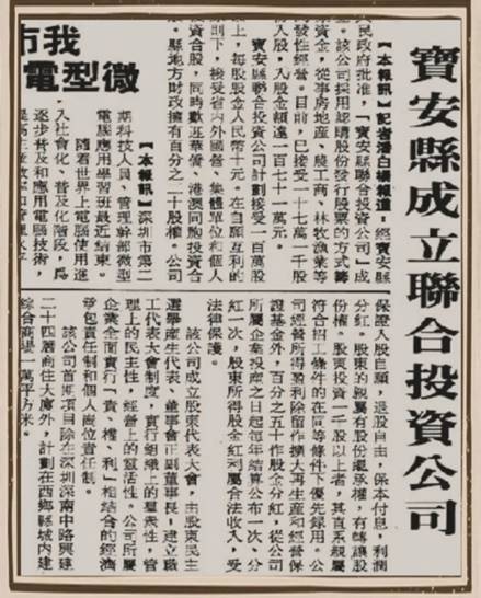 1983年7月25日,寶安縣聯(lián)合投資公司在《深圳特區(qū)報(bào)》刊登了招股公告,向全國(guó)公開(kāi)募股組建新中國(guó)第一家股份制企業(yè),同時(shí)印制發(fā)行了新中國(guó)第一張股票。為了確保招股順利,公司還做了一個(gè)開(kāi)創(chuàng)性的營(yíng)銷(xiāo),凡投資入股一萬(wàn)元,公司可以解決一人招工。